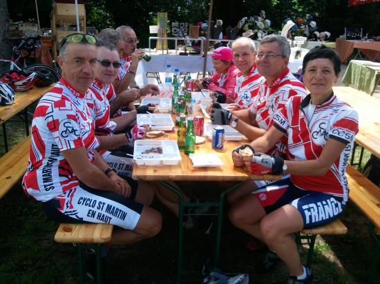 rejoignons les deux manquants à Ste Foy-l’Argentière, direction les Auberges et Tarare. Nous attaquons le col des Sauvages (723m) d’un bon coup de pédale. Regroupement au sommet et descente sur Amplepuis, puis Cublize. Nous avalons le col de la Cambuse (708m) sans problème, et nous voilà à Grandis où nous ne prenons pas tous la même route mais nous nous retrouvons après quelques hectomètres. Et c’est le col des Echarmeaux (720m), ça roule fort devant, le peloton s’étire rapidement mais tout le monde se retrouve au sommet où une petite fête nous attend, avec plateaux repas et bières pour la récupération. Nous passerons même sur le journal car une reporter du «Progrès» nous interviewe et nous photographie sur toutes les coutures. Un moment bien sympathique où nous avons gouté les produits du terroir et les gâteaux faits maison. Nous continuons notre périple par le col de Champ-juin, (742m) puis Monsols. Et nous voilà encore devant une difficulté, le col de Crie (622m) suivi du col du Fût d’Avenas (762m) et enfin le col de Brouilly ouf !... c’est le dernier pour aujourd’hui. Nous arrivons enfin à Vaux-en- Beaujolais, lieu du célèbre roman « Clochemerle » écrit en 1934 par Gabriel Chevallier. Nous assistons à la sortie d’un mariage, la route est très encombrée et notre ami Marc en est quitte pour une chute heureusement sans gravité. Mais notre gîte est à coté d’une Madone, et c’est là que le bât blesse, il nous faut grimper une pente abrupte, la plus dure de la journée, mais le point de vue est à la hauteur de l’effort. Nous avons parcouru 168km avec un dénivelé de 2300m, pas mal non ?