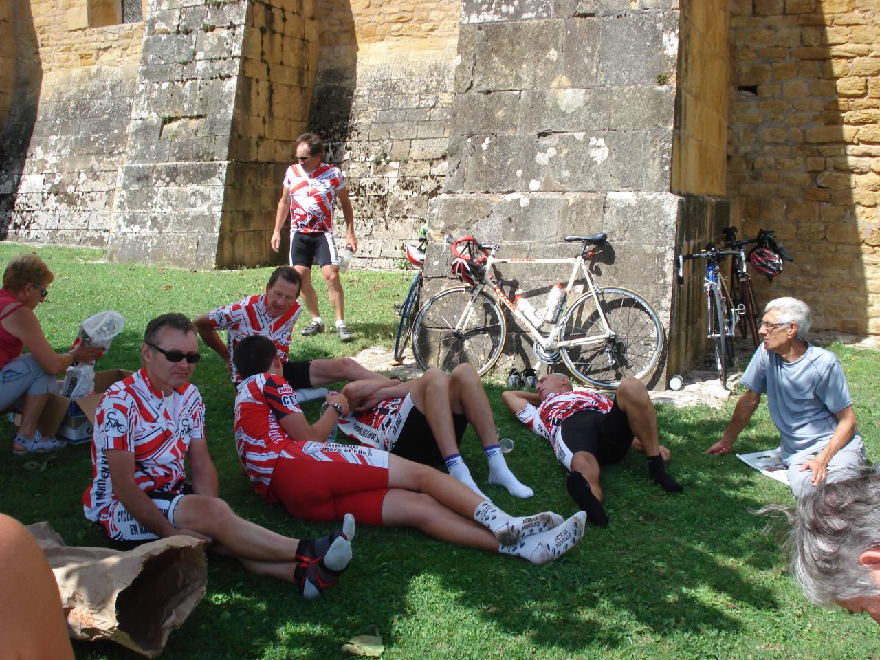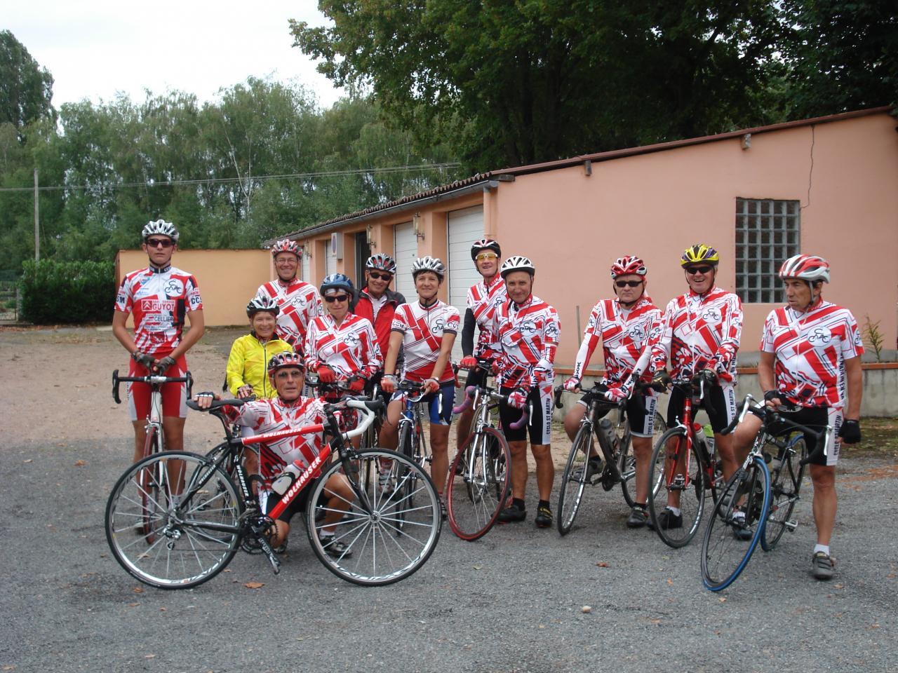 La météo n’est pas engageante et notre hôte accepte que nous sortions le pique nique dans une salle de réunion au sous-sol de son établissement. Il était prévu que nous mangions dehors mais Charles a bien défendu notre cause et nous sommes à l’abri. Charles a distribué les parcours et nous voilà partis pour un tour de 80 km environ ! Nous prenons la direction de Marcenat, puis St Pourçain-sur -Sioule, La Ferté-Hauterives, Bessay-sur-Allier (les six jours…) Neuilly-le-Réal et retour au sud vers Varennes-sur-Allier. Pour marquer ma joie d’arriver, je fais un trainard de 3 m environ sur le gravier devant l’hôtel ! Résultat : mon pneu arrière déchiré sur 30 cm ! (c'est malin!) Après la douche, je retrouve mon vélo en parfait état de marche, roue gonflée à 7 bar, comme par magie ! C’est bien, les copains !!!! J’en serais pour l’apéro……