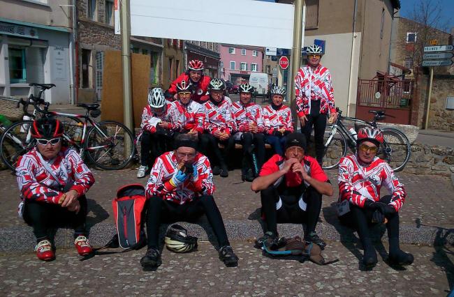 Le vent du nord nous pousse et nous commençons à nous dire qu'il n'en sera pas de même sur le retour. Quant à la vallée, à part un bitume un peu chaotique, elle est toujours aussi belle. Des travaux pour aménager le cours d'eau sont en cours, j'ai vu une échelle à poissons pour favoriser les remontées de truites ou autres salmonidés. La montée se fait tranquillement, nous tenons pratiquement toute la route, et pour cause, nous n'avons trouvé qu'une seule voiture sur les 15 km de montée. Nous traversons Annonay au moment du déjeuner, donc pas de circulation. Le vent est maintenant bien présent, la météo avait annoncé des rafales à 80km/h (un peu pessimistes les météorologues). La montée vers Bourg-Argental par le lac de Ternay est assez vallonnée, le vent de plus en plus présent nous secoue un peu mais n'empêche pas notre progression. Petite halte à Maclas pour un petit casse-croûte réparateur sous un soleil radieux. Nous voici déjà à Pélussin, tout le monde suit sans trop de difficultés pour le moment. Des petits groupes se forment pour la montée au col de Pavezin, mais nous nous rassemblons tous en haut et attaquons une descente à tombeau ouvert jusqu'à Rive-de-Gier. Marc P. et André nous quittent pour remonter par St Martin-la-Plaine car ils sont venus à vélo ce matin jusqu'à Mornant, ils vont faire plus de 200 km. Nous reprenons notre bonhomme de chemin, abandonnons Hélène qui avait garé sa voiture à la Madeleine. Une dernière difficulté et peut-être la plus dure en pourcentage avant d'arriver à St Jean-de-Touslas, il ne nous reste plus qu'à rejoindre Mornant, la bière et le pâté ont été très appréciés chez Louis.